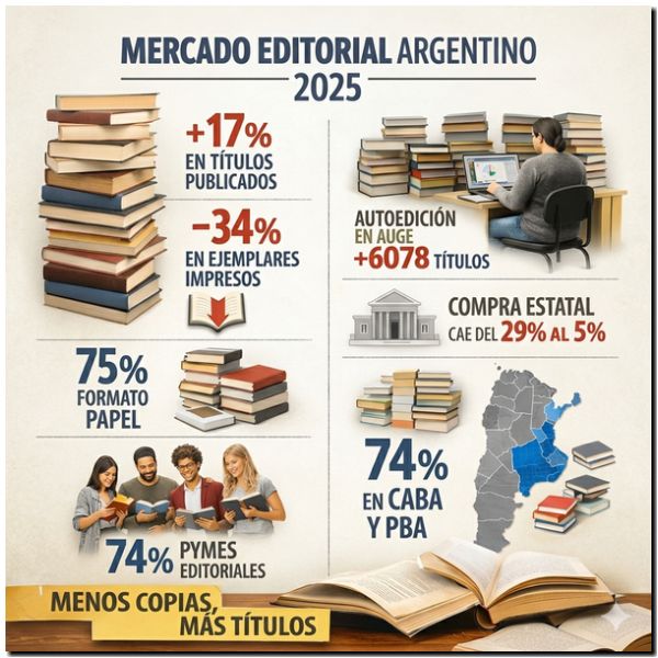 El mercado editorial argentino atraviesa una situación contradictoria. Por un lado, la producción de nuevos títulos alcanzó un récord en 2025, con un crecimiento del 17% respecto a 2024, según el informe anual de la Cámara Argentina del Libro (CAL). Sin embargo, esta producción no se tradujo en un aumento de la cantidad de ejemplares que circulan en las librerías.